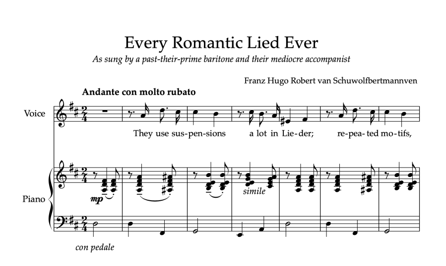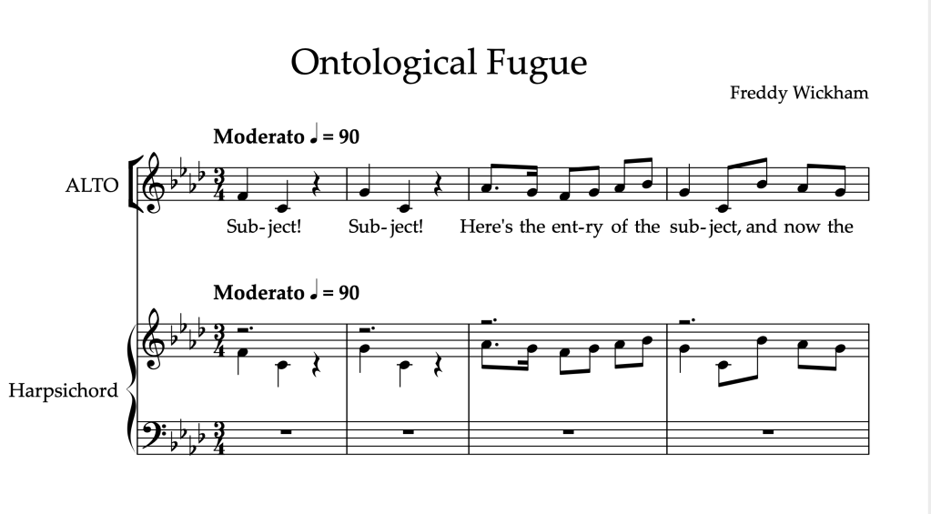 The Ontological Fugue is a choral 3-part fugue for SAB, in which the lyrics explain the structure of a fugue. It is an ideal concert encore or educational tool.